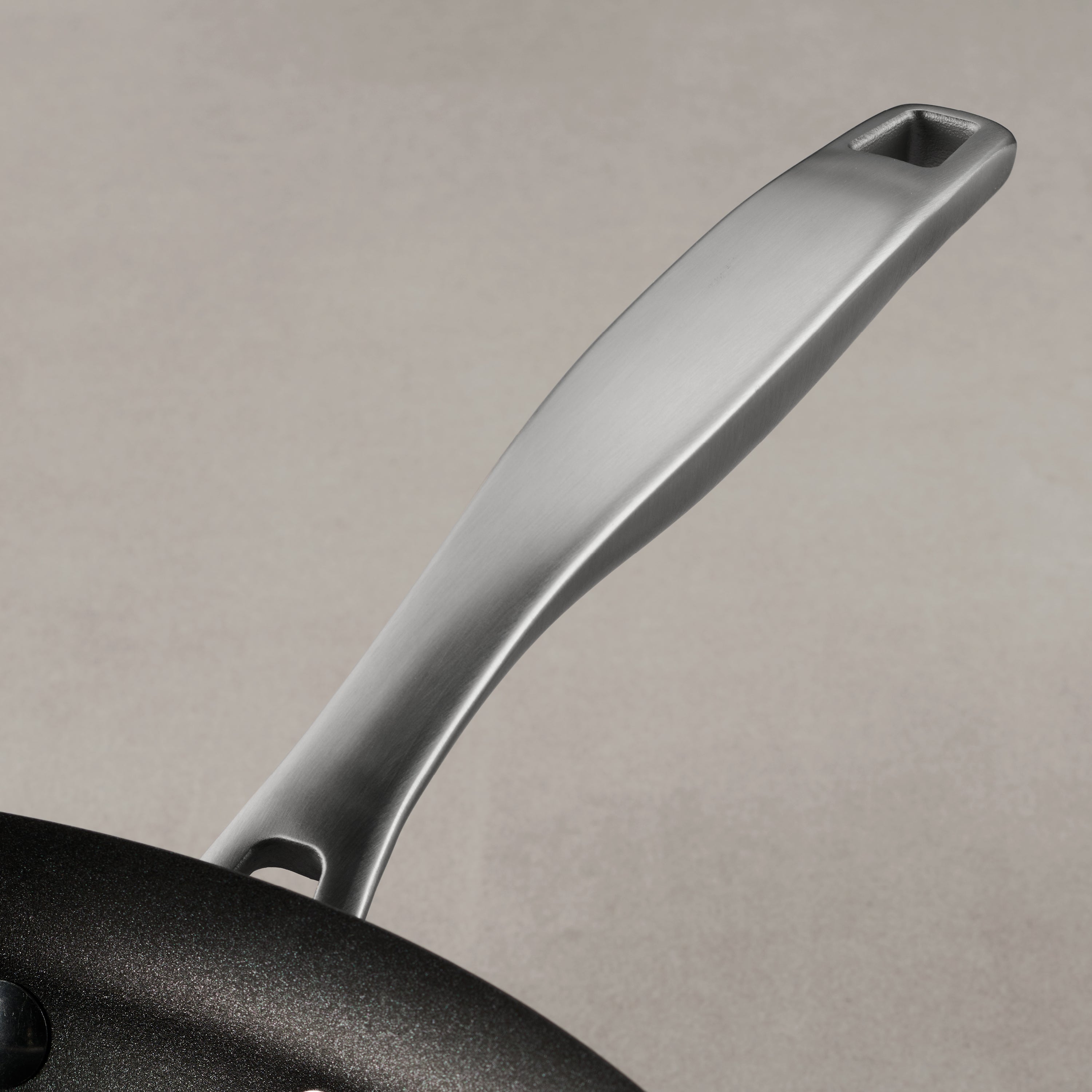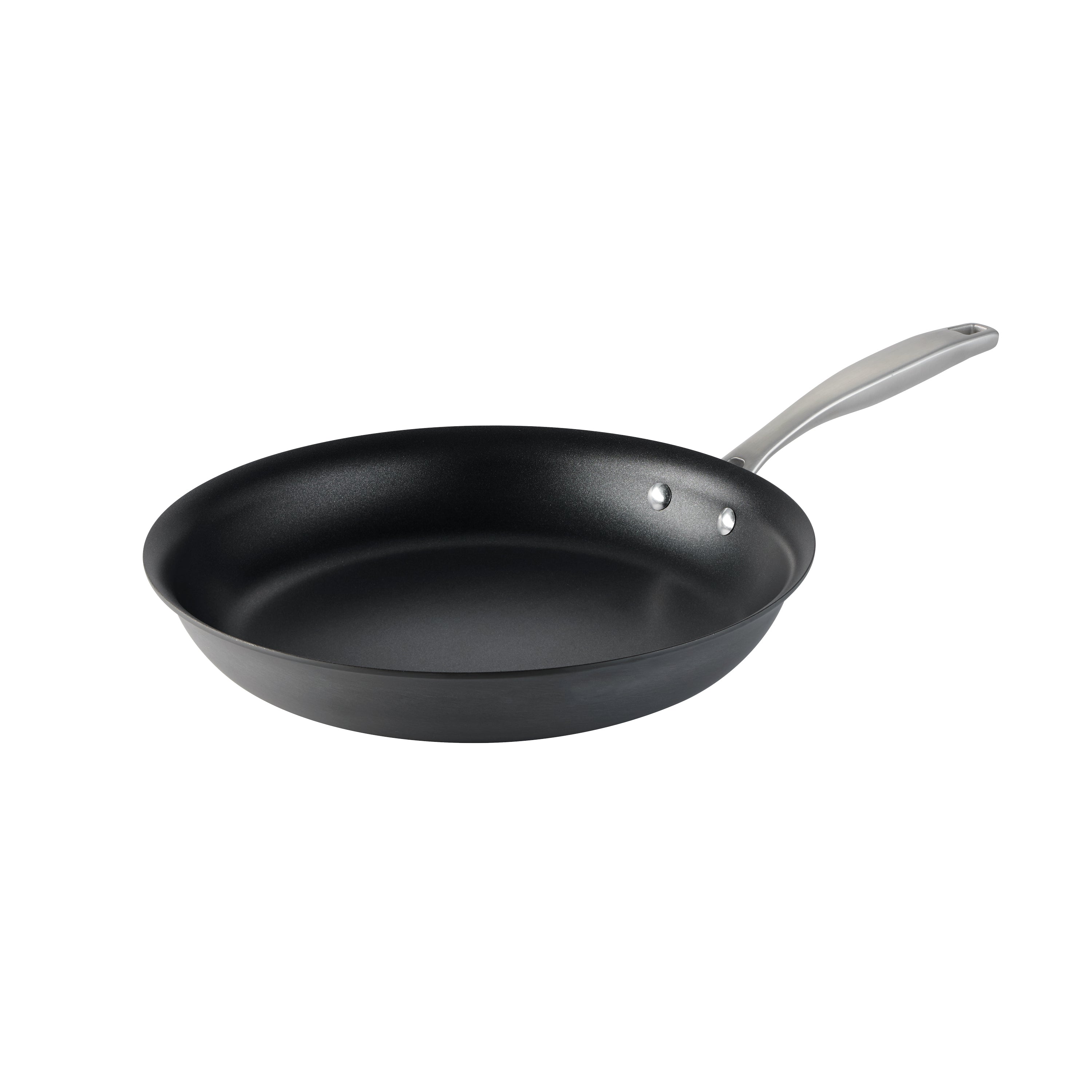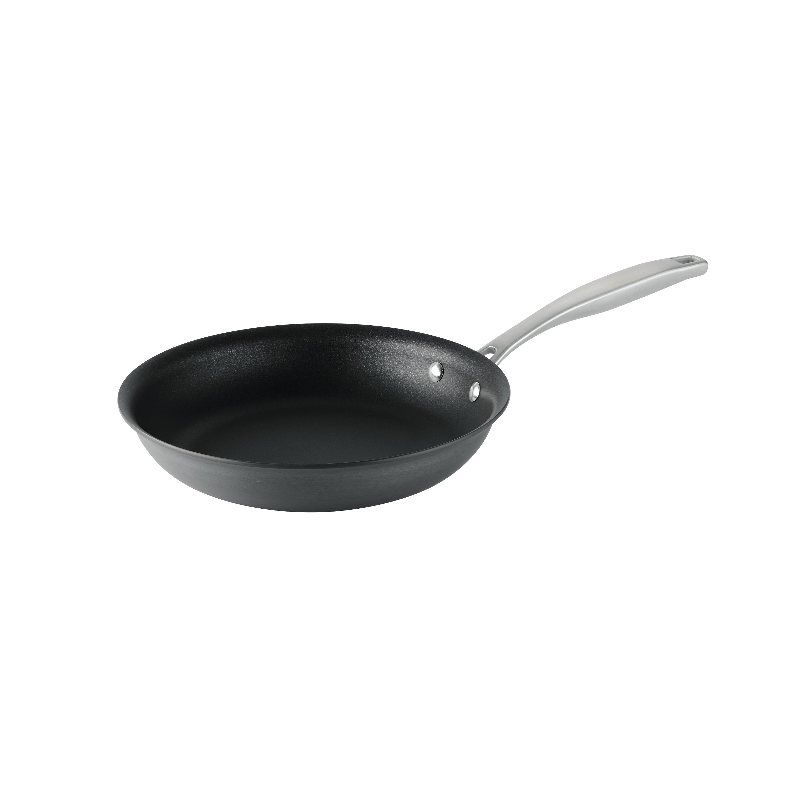 Tramontina 2 Pk - 10 in and 12 in Hard Anodized Aluminum Fry Pan Set will help you stock your kitchen with durable fry pans expertly made for golden sears, perfect eggs, even simmers, and crispy frying. The hard anodized, heavy-gauge aluminum set boasts a smooth exterior finish paired with a reinforced, nonstick interior coating that is made without lead or cadmium - keeping your food from sticking and makes for quick clean-up. A precision cast stainless steel long handle on each pan allows for safe and easy maneuvering - including smooth flips of pancakes, crepes, and omelets. Compatible with gas, electric and ceramic glass cooktops, these pans are also oven-safe up to 350°F / 176°C.