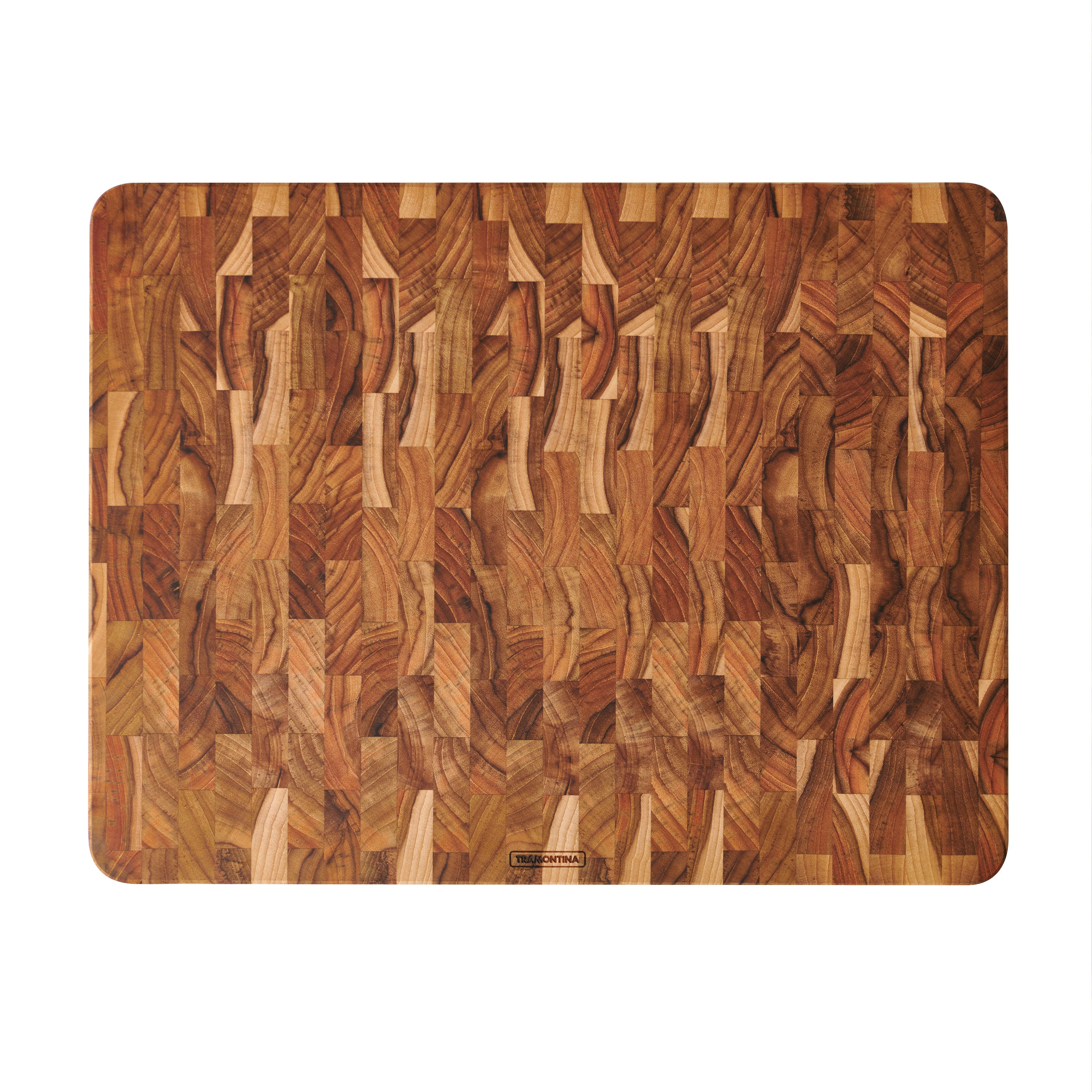 You'll notice Tramontina's 17.75 in x 13.5 in Teak Wood End-Grain Chopping Board thanks to their distinctive pattern. You'll love the chopping board - favored by cooking enthusiasts, because it requires little to no maintenance. End-grain chopping boards are made from the short pieces of lumber - in our case, durable, authentic Brazilian teak wood - that are grafted together vertically with the end pieces making up the surface. The look is as eye-catching as it is functional. The board's dense surface also makes it more stable during use - while its carved out groove along the edge catches juice or liquid so it won't spill over the side.