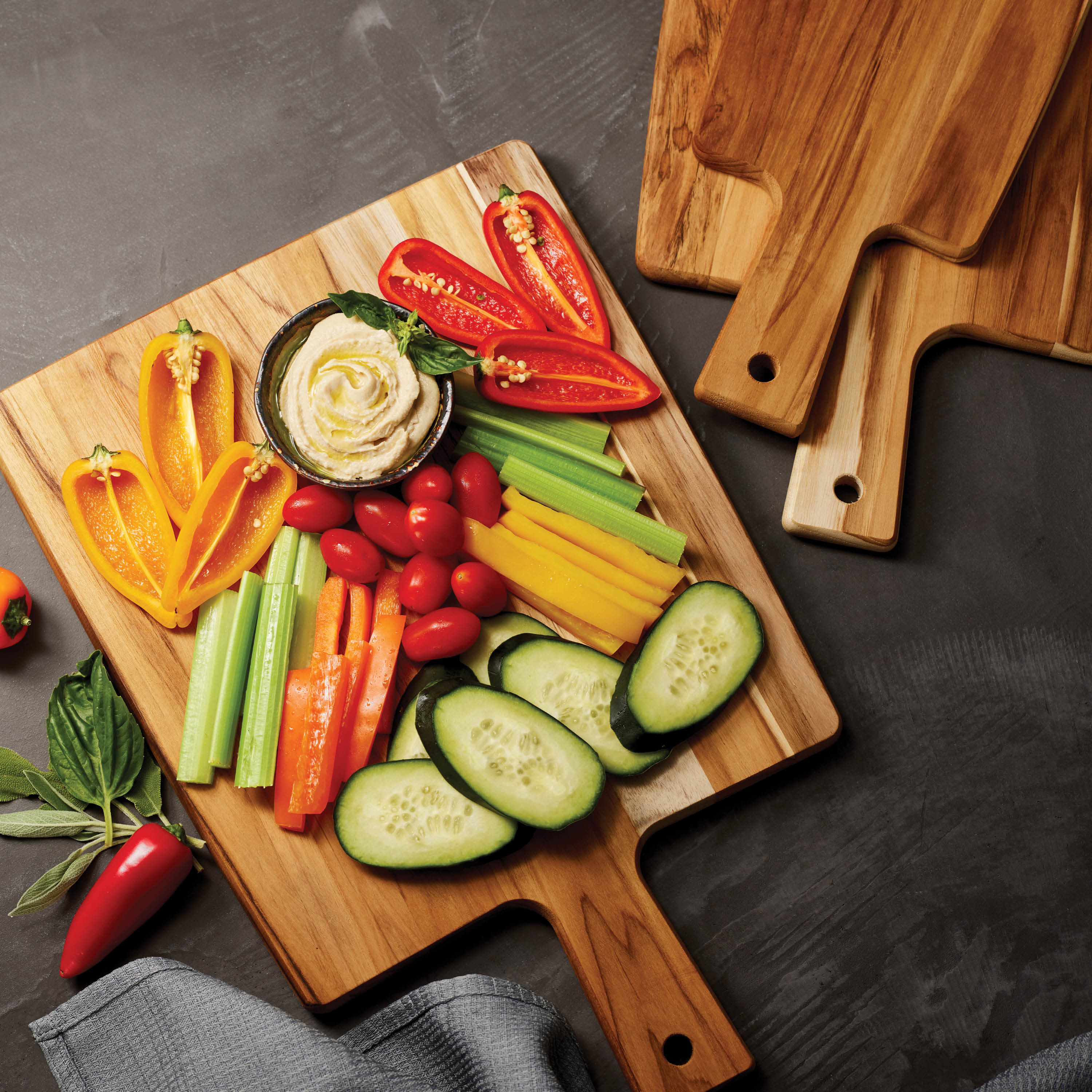 Tramontina's 3 Pc Teak Wood Kitchen Boards with Handle are the kitchen multi-taskers you need. With three sizes ready to go, You'll be able to do everything from dicing small vegetables and slicing charcuterie to chopping large cuts of meat. The handles allow you to easily serve and put these boards to work as charming serving platters. Crafted from durable, authentic Brazilian teak wood, the cutting boards sit steady on any countertop, and ergonomic handles offer easy maneuverability while serving. Teak wood is known for its density - making it a stable cutting surface that is less prone to rocking or slipping during use. Tip: Love snapping gorgeous photos of your favorite homemade recipes? Our teak wood cutting boards make delightful backdrops.