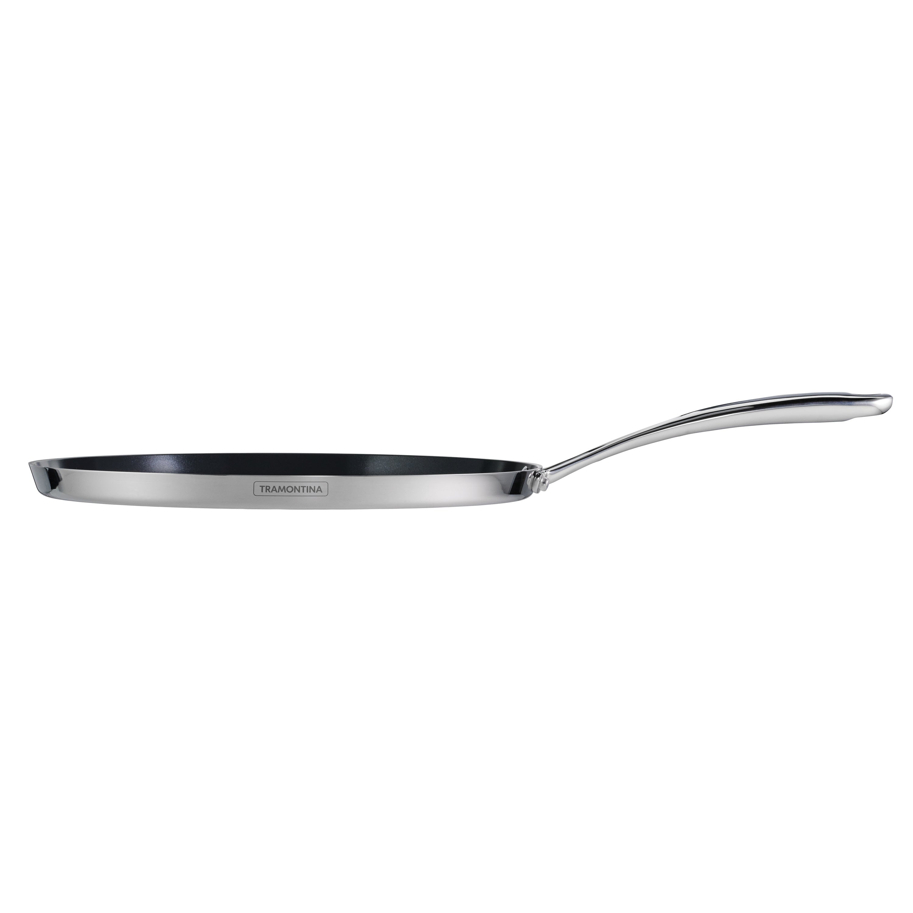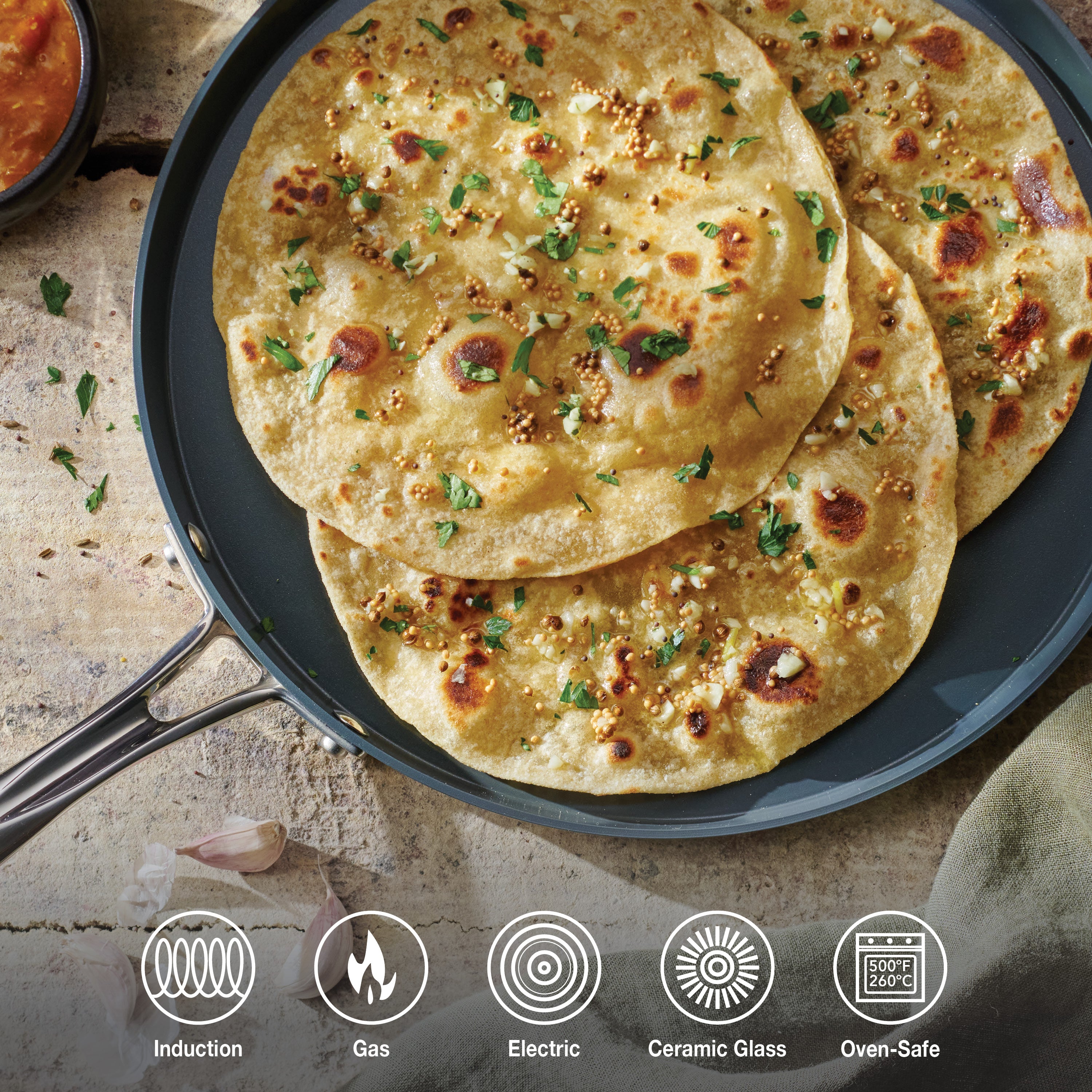 Discover a new way to celebrate culinary heritage with the Tramontina Utsava Ceramic-Coated Stainless Steel Dosa Tawa. Designed to honor the rich traditions of Indian and South Asian cooking while embracing modern techniques, this flat pan is perfect for making thin, crispy dosas, flatbreads, tortillas, and more. The Utsava Tawa blends timeless craftsmanship with contemporary performance, bringing the spirit of celebration to your kitchen. Crafted with a premium tri-ply clad construction, this dosa tawa features an aluminum core between layers of polished stainless steel, ensuring quick and even heat distribution for consistent results. Whether you're frying, searing, or creating perfectly golden dosas, this pan's durable design stands up to everyday use, maintaining its sleek look and superior cooking ability. This tawa is compatible with all cooktops, including induction, and is oven-safe up to 400°F, making it versatile enough for a variety of cooking styles. The ergonomic, stay-cool stainless steel handle ensures safe and comfortable handling. From flipping and frying to quick steams, this pan is designed to keep you in control.