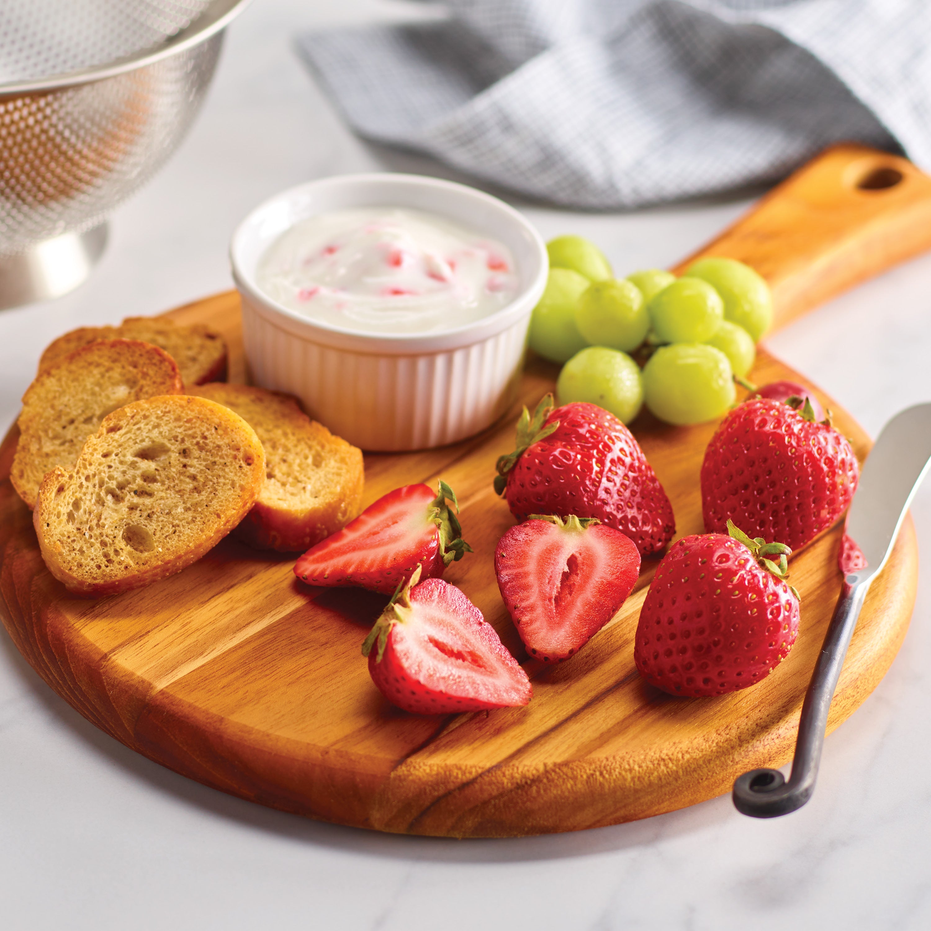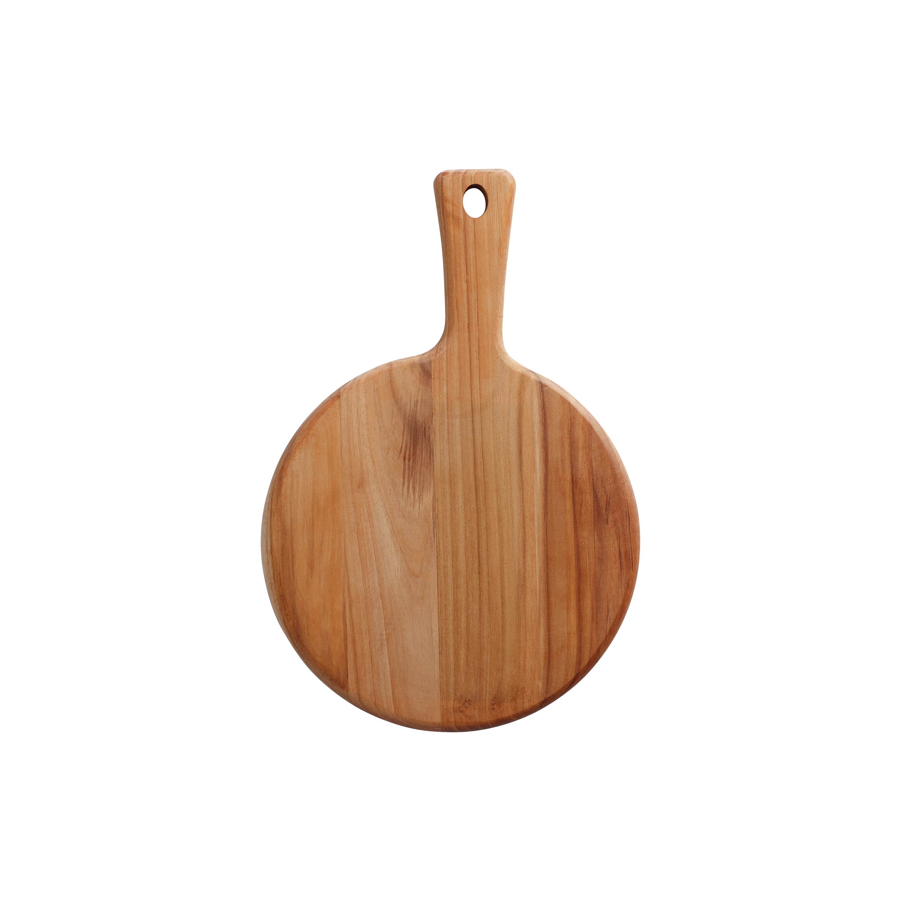 Tramontina's 13.25 in x 9 in Teak Wood Round Cutting Board with Handle gives you a whole new way to serve your favorite dishes, from pizza to baked goods and bread. Protect your countertops, handle your slicing, dicing, and chopping tasks, and charm guests with a unique serving board or charcuterie platter. Crafted from durable, authentic Brazilian Teak wood, with a convenient handle for serving, the cutting board sits steady on any countertop. Tip: Love snapping gorgeous photos of your favorite homemade recipes? Our Teak wood cutting boards make delightful backdrops.