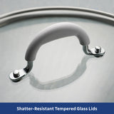 - Tempered glass lid lets you monitor cooking without losing heat.