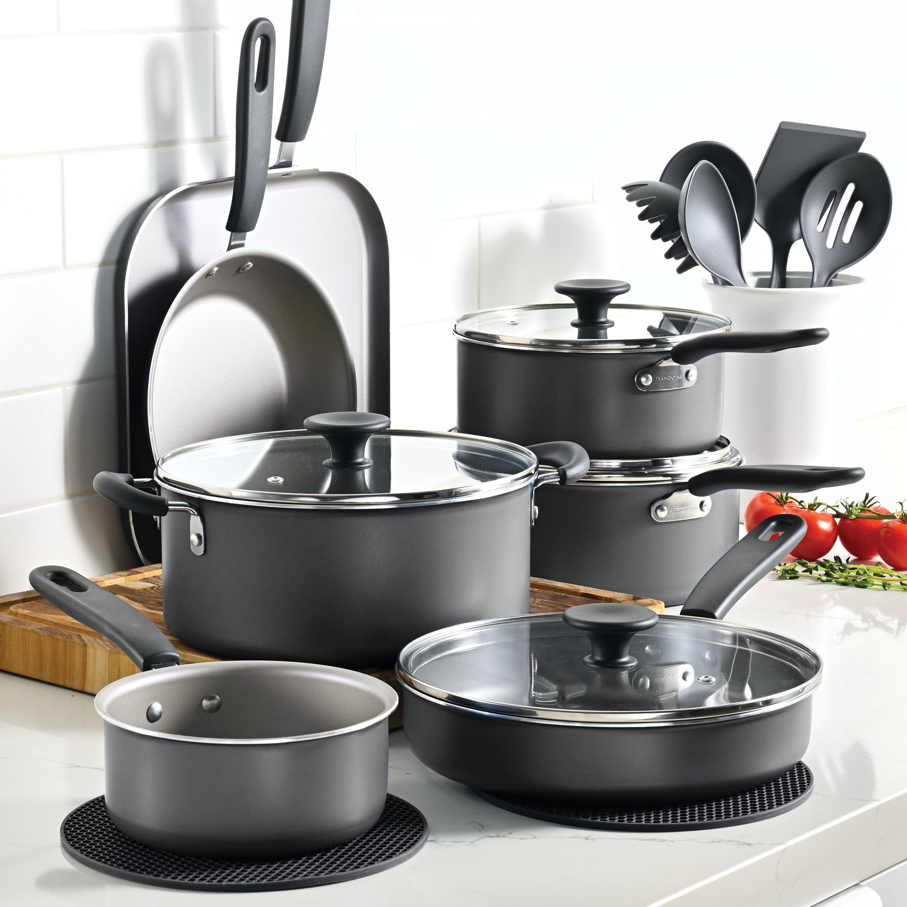 The Tramontina Primaware 18-Piece Nonstick Cookware Set includes the essential pots and pans you need for everyday cooking. From eggs and pancakes to pasta, soups, and one-pot dinners, this set helps you prepare meals with confidence. The nonstick interior helps reduce sticking and makes cleanup easier after busy weeknights. Lightweight aluminum construction makes handling simple, while tempered glass lids allow you to monitor cooking without losing heat. A great value option for first homes, college apartments, or updating your everyday cookware.