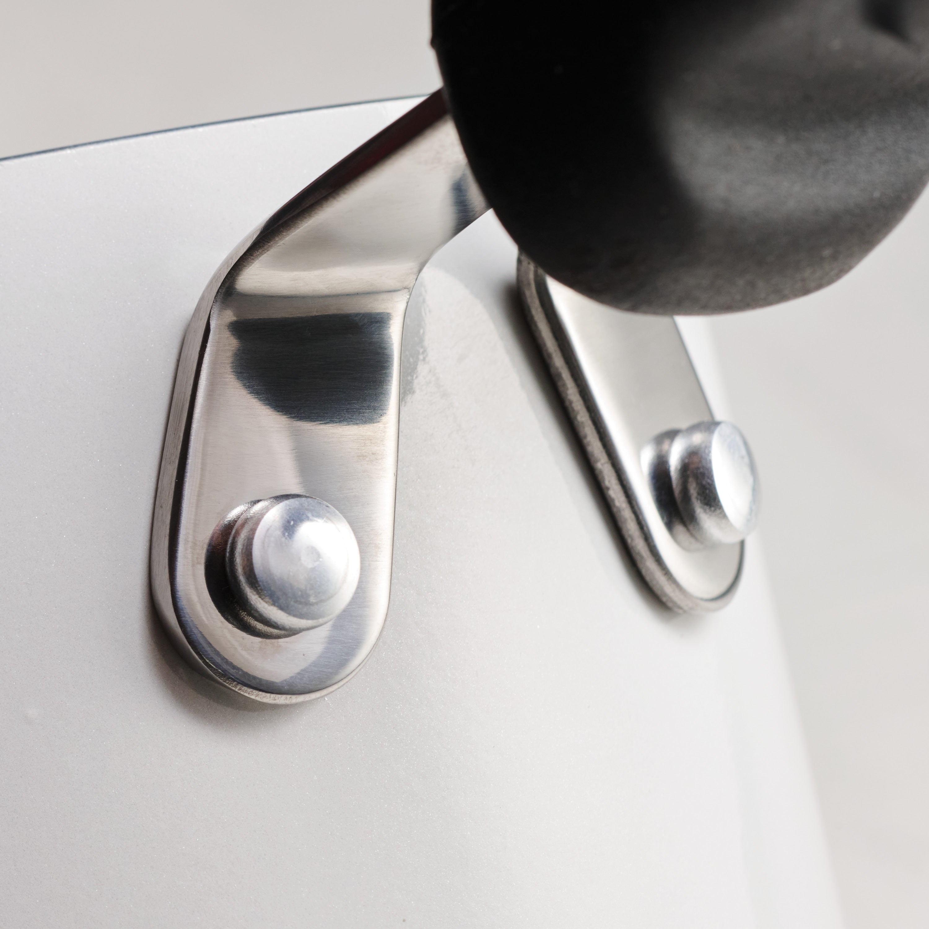 Soft-grip handles stay cool and comfortable while cooking, and shatter-resistant glass lids let you keep an eye on every simmer. When you’re done, the entire set nests neatly together, saving you up to 50% more cabinet space.