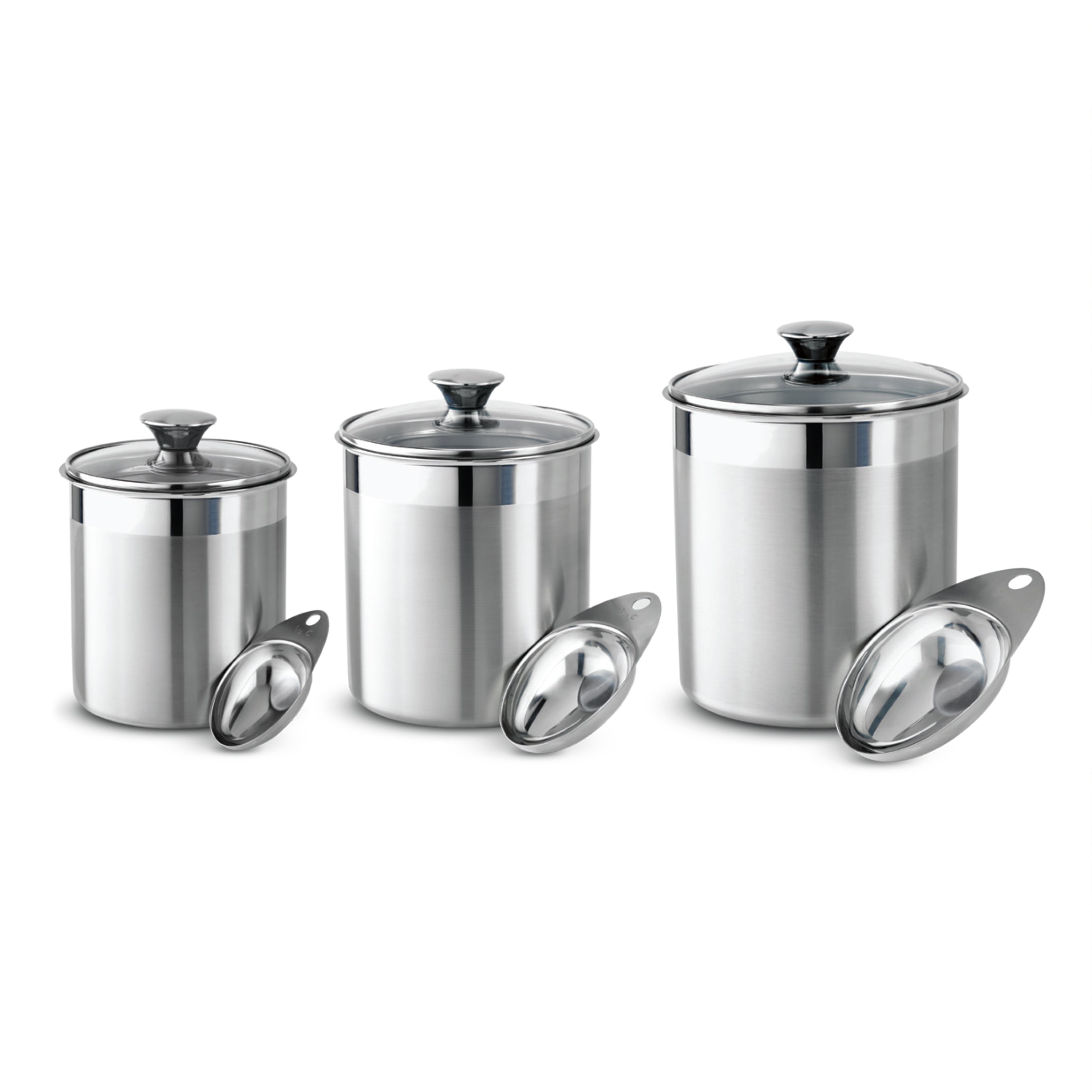 Tramontina's 6 Pc Stainless Steel Covered Canister Set with Measuring Scoops is a stylish and elegant storage option that looks great on the counter, and keeps your daily staples within reach. Tight-fitting, see-through lids help to keep your food fresh, and lets you know at a glance, what you have stored inside without lifting the lid. Since they're made of durable, easy-to-clean, premium 18/10 stainless steel, they won't impart flavor onto your food. Convenient measuring scoops allow you to easily access the ingredients from the canisters. This set of canisters is part of the TRAMONTINA GOURMET collection, which features timeless products crafted especially for the cooking enthusiast. Made in Brazil.