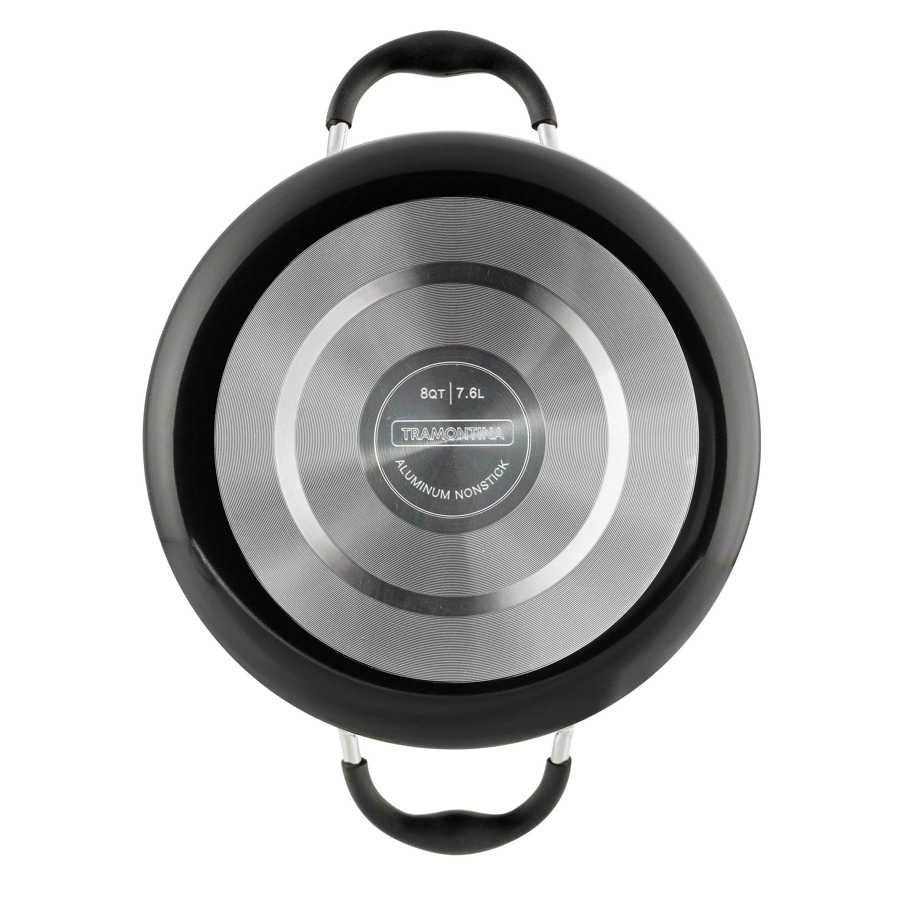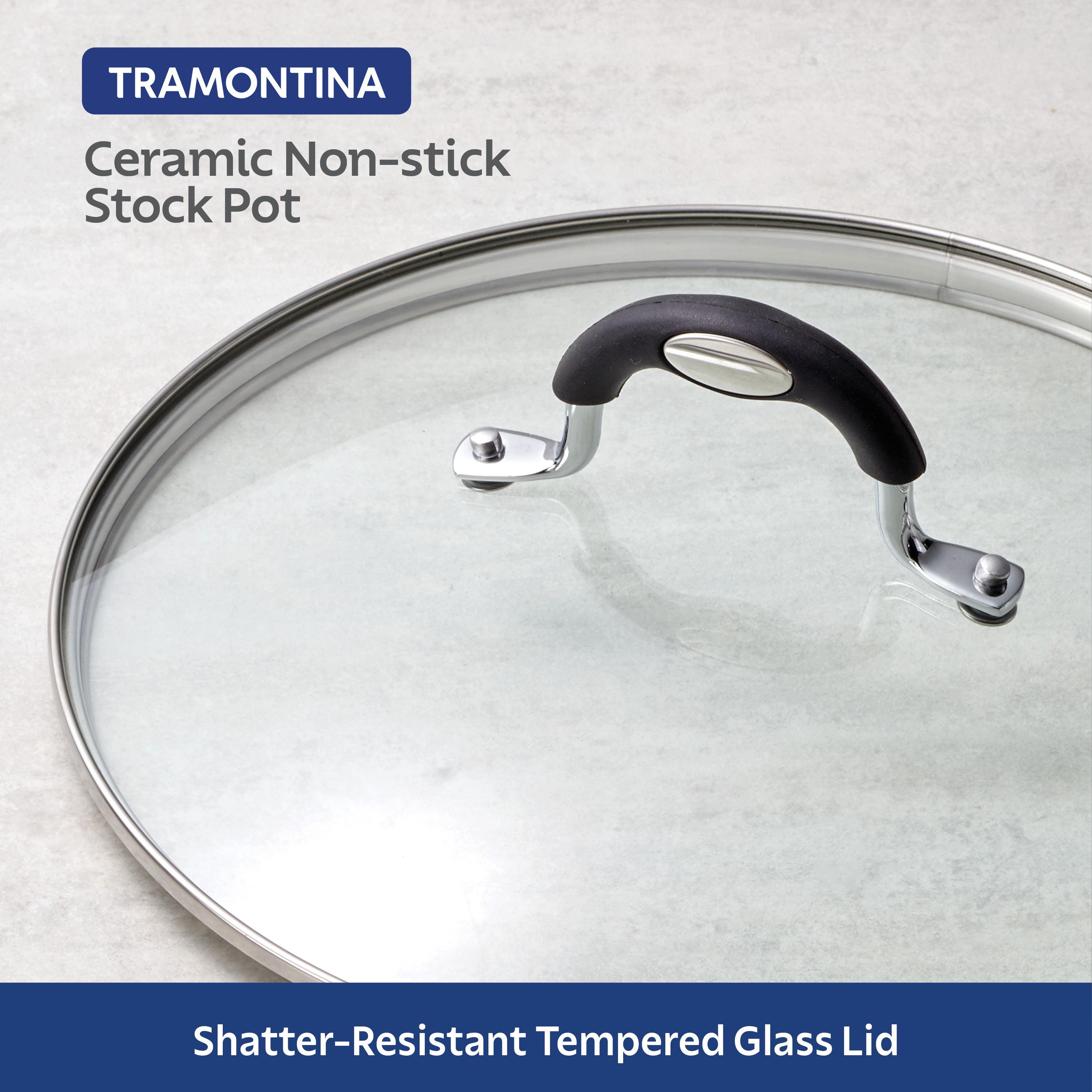 Tramontina's Aluminum 8 Quart Ceramic Nonstick Covered Stock Pot is perfect for cooking pasta, preparing soup, boiling veggies, or simmering chili. Crafted from heavy-gauge aluminum, this stock pot offers quick, even heat distribution. The ceramic nonstick interior ensures effortless food release and easy cleanup. The heat- and shatter-resistant tempered glass lid allows you to monitor your cooking progress, while the stainless steel stay-cool handles feature a soft black silicone grip for comfortable handling. This dishwasher-safe cookware is compatible with gas, electric, and ceramic glass cooktops. This stock pot is a durable, stylish addition to any kitchen.