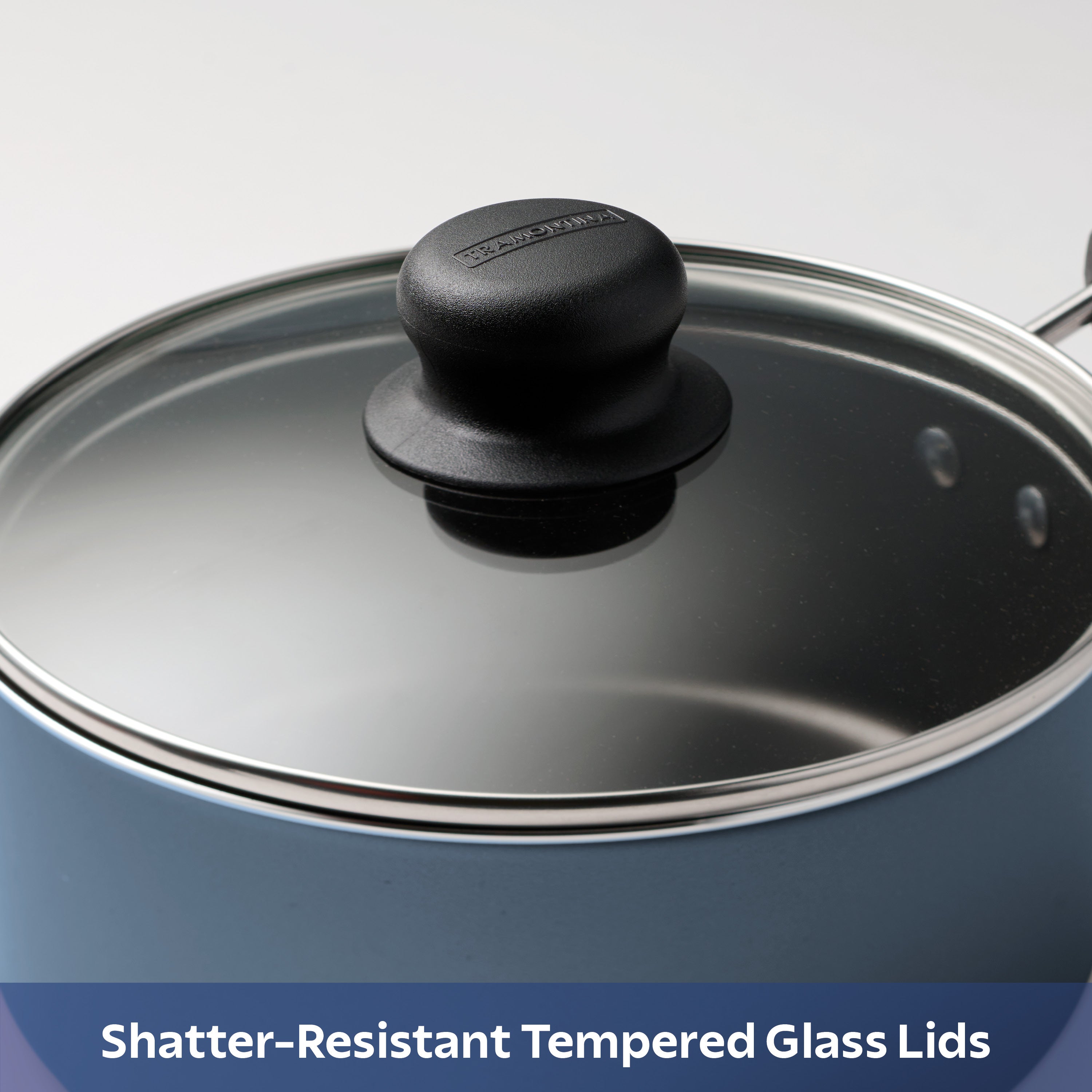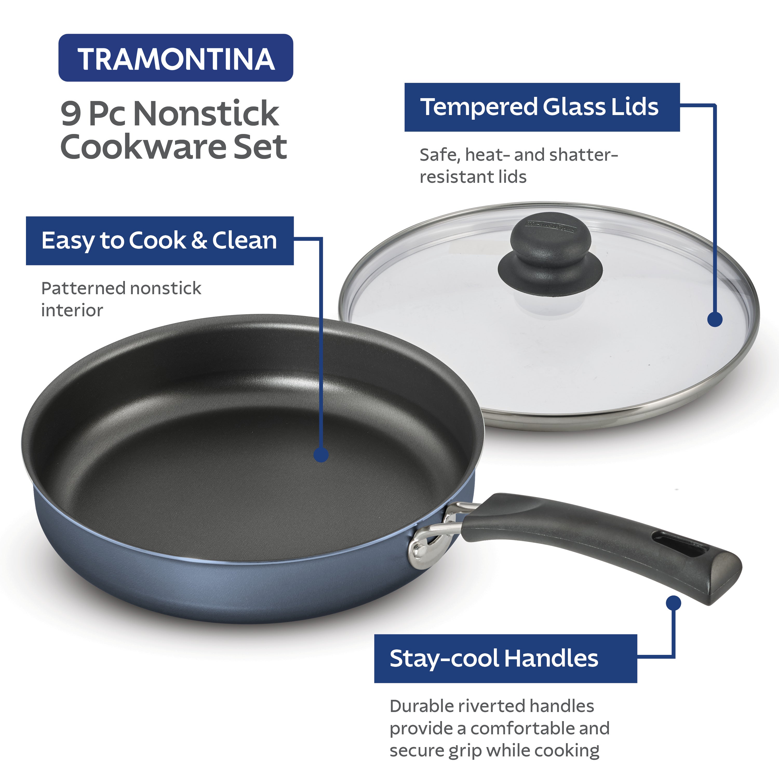 The Tramontina Simple Cooking 9-Piece Nonstick Cookware Set is a great value for home cooks looking for everyday versatility and easy cleanup. Made from lightweight aluminum, these durable pots and pans heat quickly and evenly for consistent cooking results. The reinforced nonstick coating features Starflon T1 technology that offers effortless food release and exceptional resistance to scratches and wear, making this set ideal for daily use. Heat- and shatter-resistant tempered glass lids help lock in moisture while giving you a clear view of your cooking. Stay-cool handles are riveted for added strength and safety. This nonstick cookware set is compatible with gas, electric and ceramic glass cooktops. Whether you’re outfitting your first kitchen or upgrading your current setup, the Tramontina Simple Cooking 9-Piece Set has the essential pots and pans you need for frying, simmering, boiling and more.