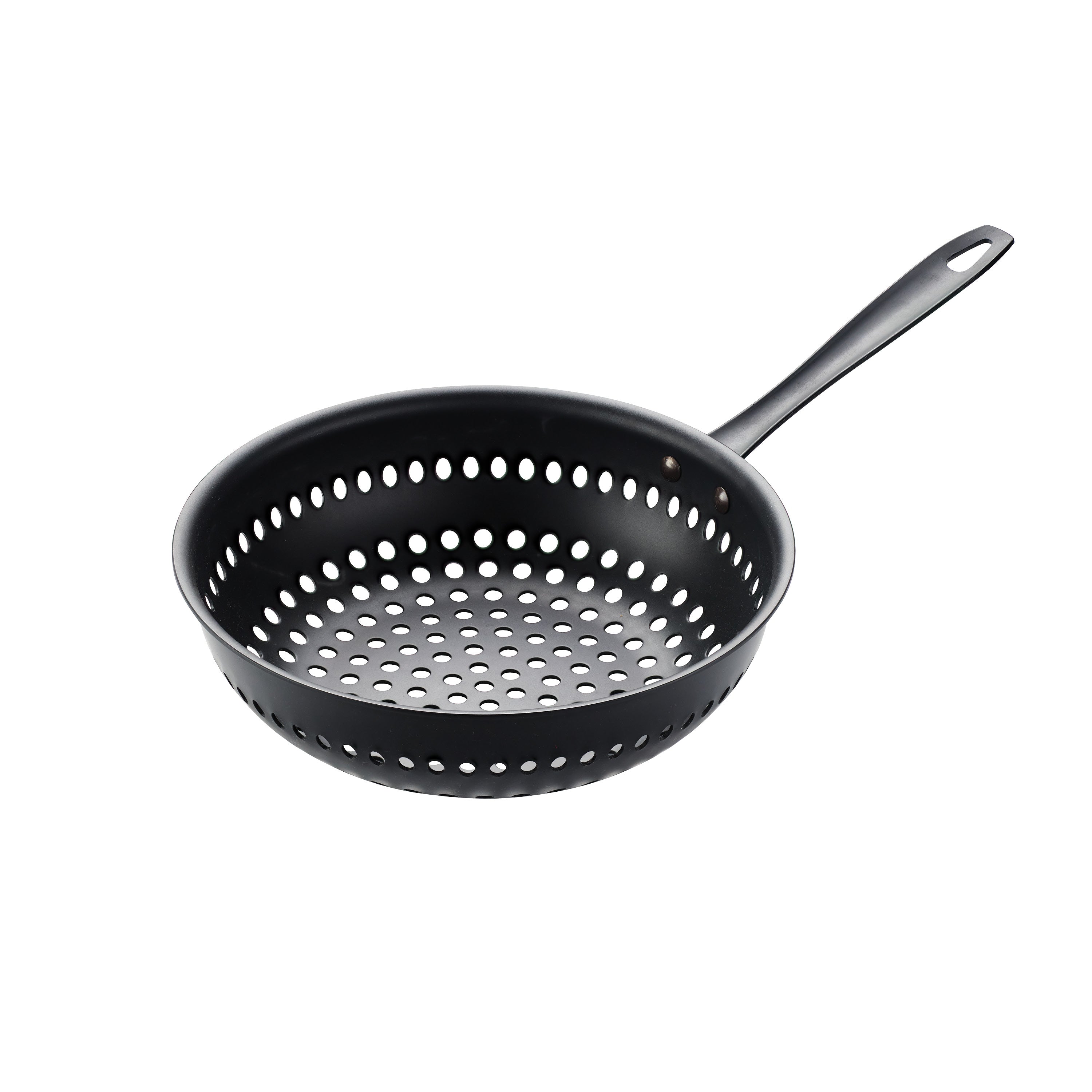The Tramontina 10" Round Perforated Carbon Steel Stir Fry brings the pleasure of stir fry cooking to the great outdoors. Made of sturdy carbon steel with heavy duty rivets that secure the handle, able to endure the heat of a grill as you prepare your favorite meats and vegetables al fresco. Holes throughout the bottom and sides evenly distribute heat and enhance smoky flavor. Made to last in Brazil, this wok comes with a lifetime warranty.