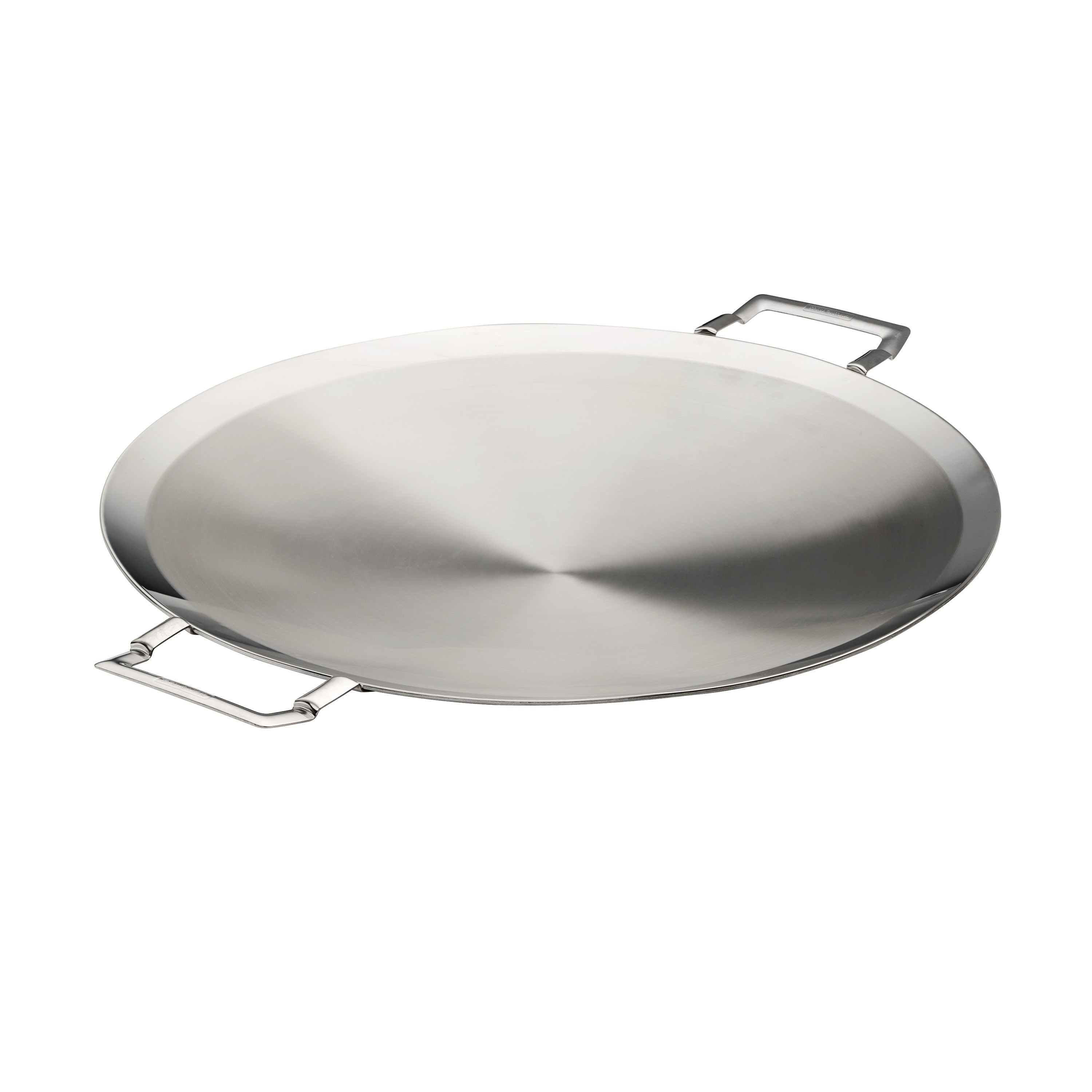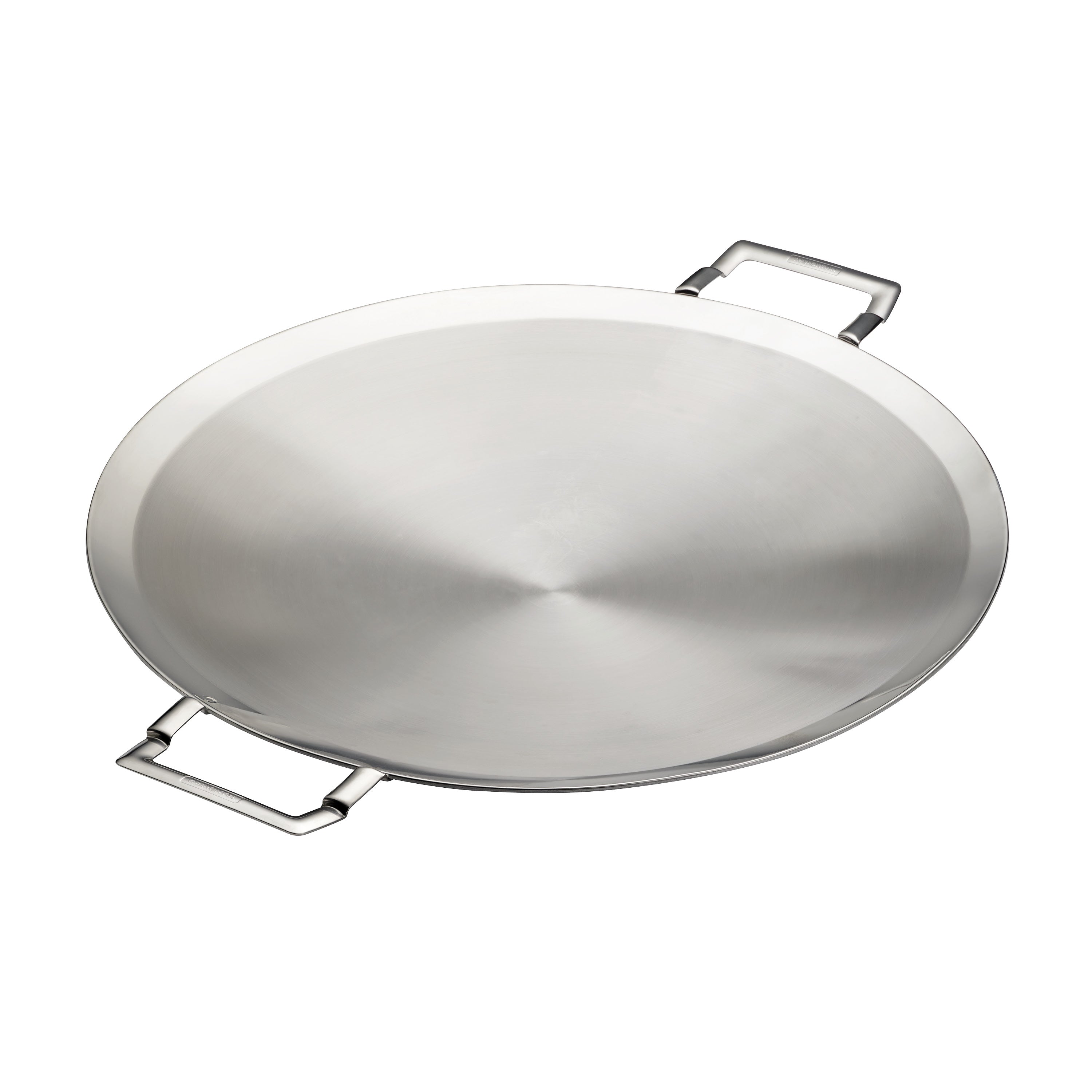 With a tri-ply clad construction, the Churrasco Round Griddle BBQ Pan makes cooking your favorite meals an absolute pleasure. The triple-ply body distributes heat evenly, making cooking faster, saving energy and keeping food warm for longer. The mirror polished exterior gleams and a fine satin interior makes it an elegant piece to add to your BBQ set. Mirror polished side handles are easy to grip, and it's oven-safe up to 400°F for baking and keeping food warm. Plus, it comes with a lifetime warranty.