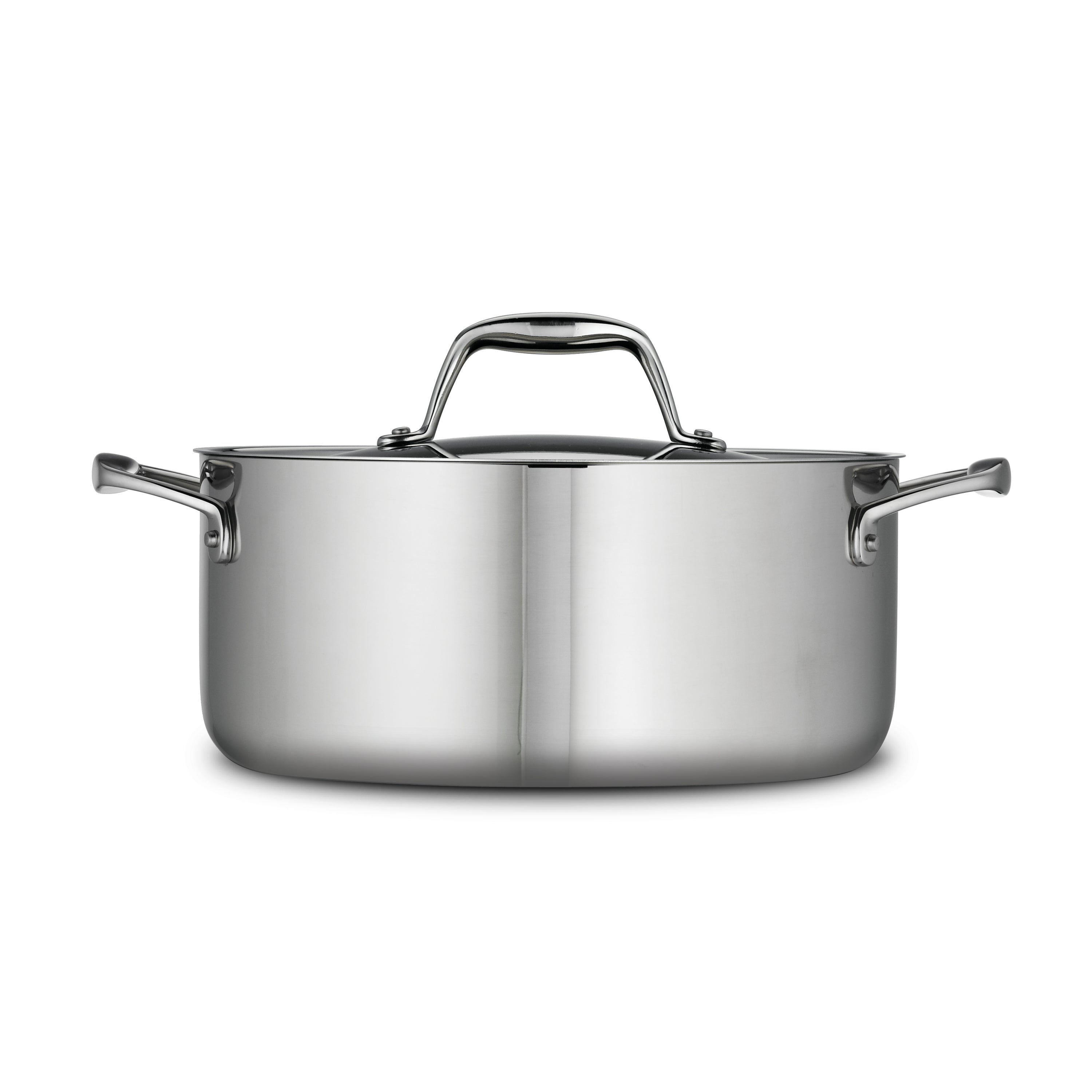 The Tramontina 5-Quart Tri-Ply Clad Stainless Steel Covered Dutch Oven is a versatile pot for cooking a wide range of dishes that will make every chef cook like a pro. Featuring tri-ply construction with an aluminum core surrounded by two layers of 18/10 stainless steel. This design ensures even heat distribution, reducing hot spots and giving you more control over your cooking. The Dutch oven is the master of the stovetop. Since it's basically a wider, heavier version of a stockpot, it's a good pick to simmer broth or cook up big batches of beans. You can use it for slow-cooking stews, braising meats, or making soups. It's great for baking bread too! The 5-quart size can serve up to 6 guests and is ideal for meal-prepping for the week ahead. The Dutch oven is NSF-certified, which means it meets high standards for safety and quality. It's safe for use in both home and professional kitchens. Designed for induction cooking, this Dutch oven is compatible with gas, electric, ceramic glass, and induction cooktops. It's oven-safe up to 500°F offering plenty of cooking options. Its sturdy handles are riveted for extra strength and make it easy to move around, even when full. This Dutch oven has a mirror-polished exterior that gives it a sleek, professional look, perfect for both cooking and serving. For best results, we recommend handwashing and using non-abrasive sponges, though it is also dishwasher-safe for added convenience. With this Tramontina 5-quart Dutch oven, you'll have the perfect pot for a variety of cooking tasks, from searing meats to simmering sauces. Its stylish design and practical features make it a great addition to any kitchen.